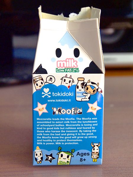 "Mozzarella leads the Moofia. The Moofia was assembled to extort milk from the lunchboxes of schoolyard bullies. Mozzarella is loving and kind to good kids but ruthless and feared by those who harass the innocent. By taking the milk from the bad and giving it to the good, the Moofia know the good will grow up strong and healthy to protect themselves. Milk is power. Milk is protection."